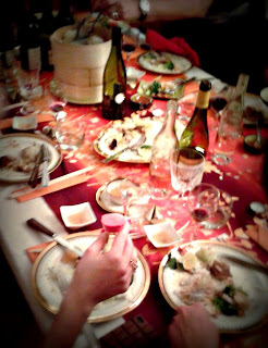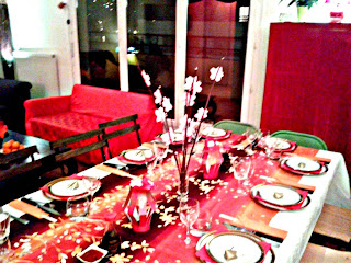 Nous avions réunis le plus d'éléments favorables à l'occasion de cette soirée (nouvel an et tradition chinoise oblige!), en suivant quelques principes de Feng Shui, l'utilisation presque exclusive du rouge et de l'orange (couleurs de chance), ainsi que la préparation de mets aux valeurs symboliques. Ce fut une soirée fabuleuse, merci à la gentillesse et la générosité de nos invités, ainsi qu'aux efforts de LRR qui servit un véritable festin!